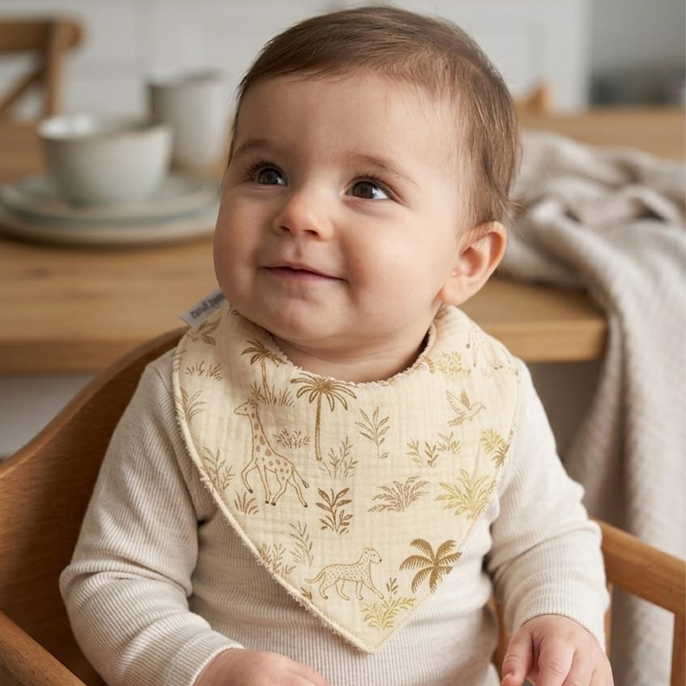 Bavoir en éponge 100% coton et gaze de coton avec des motifs jungles, doux et absorbant, idéal pour accompagner bébé au quotidien avec confort et praticité. Sa matière allie efficacité et douceur pour protéger les vêtements tout en respectant la peau délicate des tout-petits.