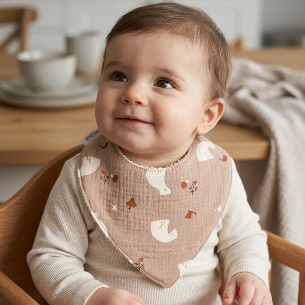 Bavoir en éponge 100% coton et gaze de coton marron avec quelques motifs, doux et absorbant, idéal pour accompagner bébé au quotidien avec confort et praticité. Sa matière allie efficacité et douceur pour protéger les vêtements tout en respectant la peau délicate des tout-petits.