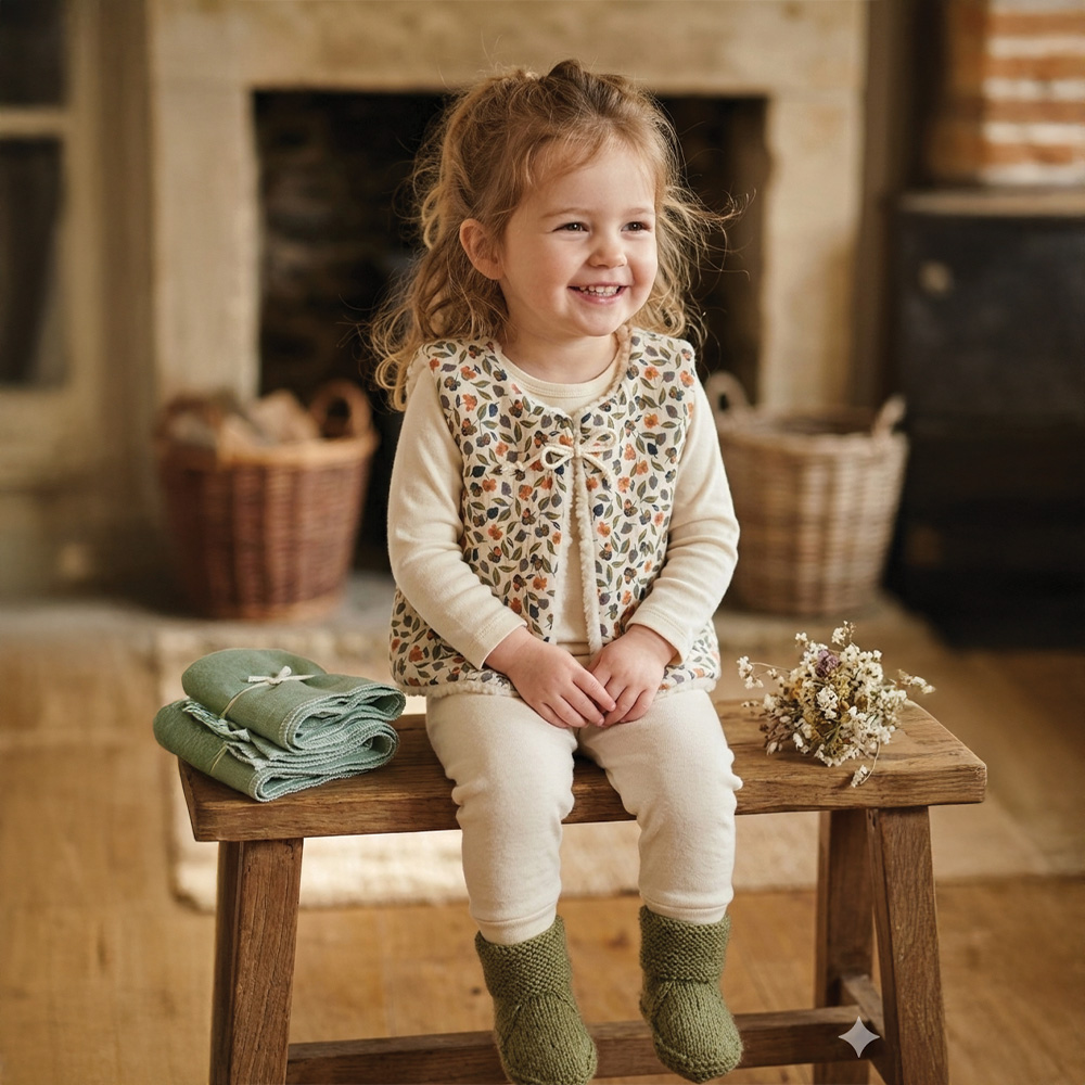 Porté sur un body, une blouse ou un pull fin, ce gilet de berger accompagne aussi bien les moments cocooning à la maison que les sorties en famille. Son style bohème et raffiné en fait une pièce incontournable du dressing enfant.