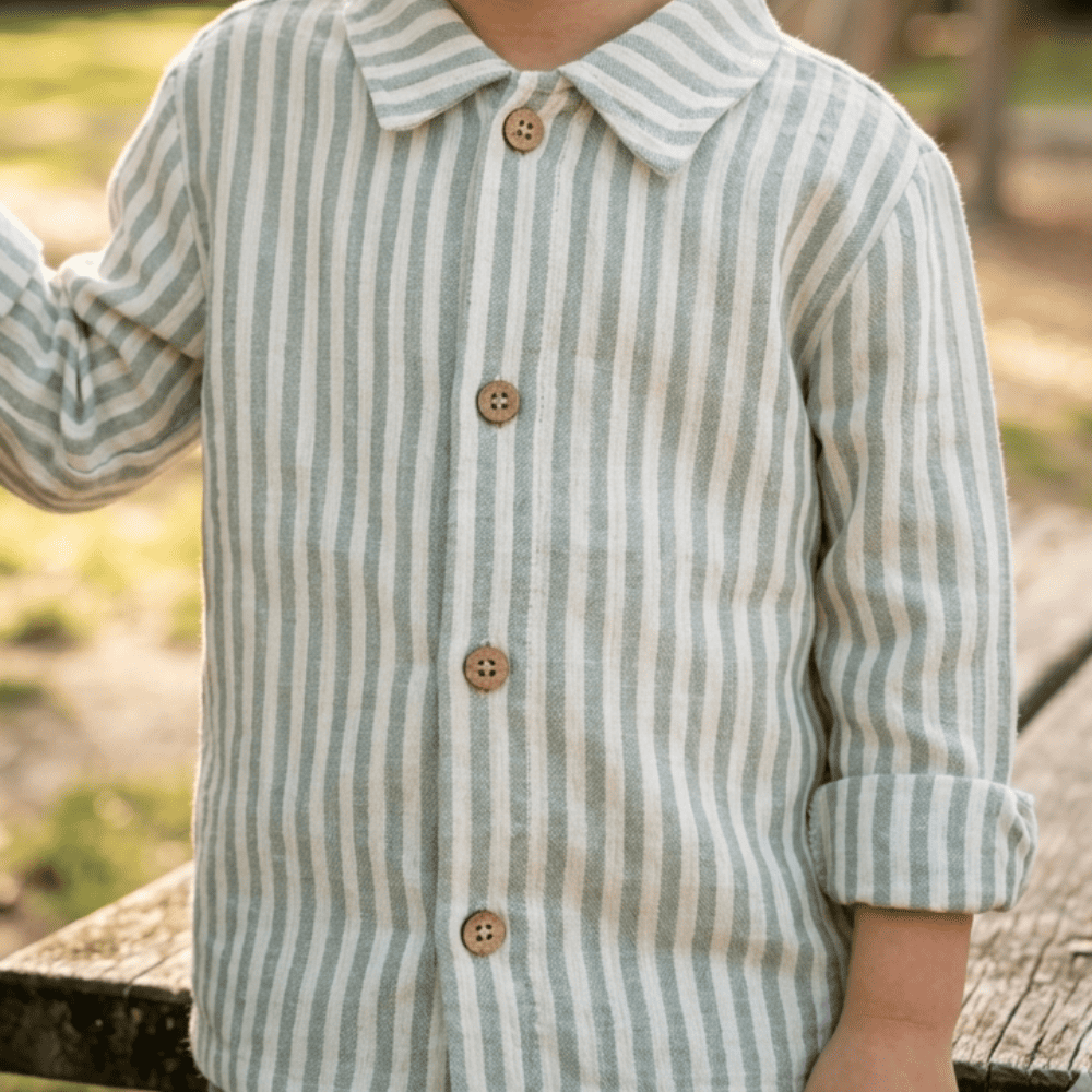 La chemise Antoine en gaze de coton vert de gris séduit par ses fines rayures et son style intemporel. Douce et légère, elle accompagne les enfants avec confort pour toutes les occasions.